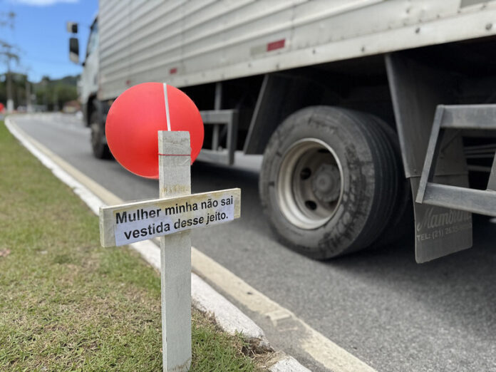 O intuito das cruzes fincadas nos canteiros é aludir às vítimas de feminicídio no Brasil. Presos a elas, balões vermelhos exibiam frases comuns que reforçam o machismo no país e no mundo.